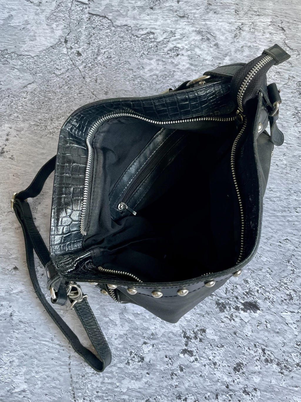 Cartera de cuero con detalles de tachas y cierres plateados con bolsillos externos.